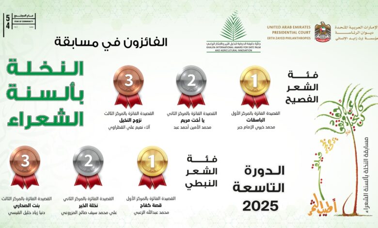 أبوظبي.. إعلان أسماء الفائزين بمسابقة “النخلة بألسنة الشعراء” بدورتها التاسعة 2025بمشاركة 698 شاعر وشاعرة من 23 دولة