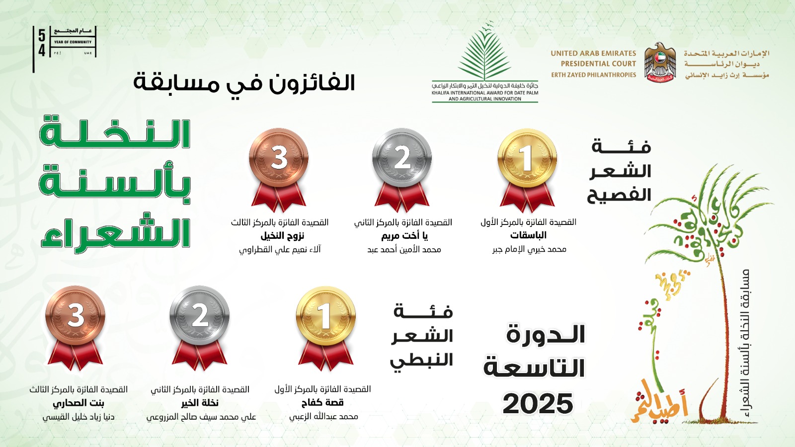 أعلنت الأمانة العامة لجائزة خليفة الدولية لنخيل التمر والابتكار الزراعي عن أسماء الفائزين بمسابقة “النخلة بألسنة الشعراء” بدورتها التاسعة 2025 التي تنظمها برعاية كريمة من معالي الشيخ نهيان مبارك آل نهيان، وزير التسامح والتعايش، رئيس مجلس أمناء الجائزة، وجاءت النتائج على النحو التالي: