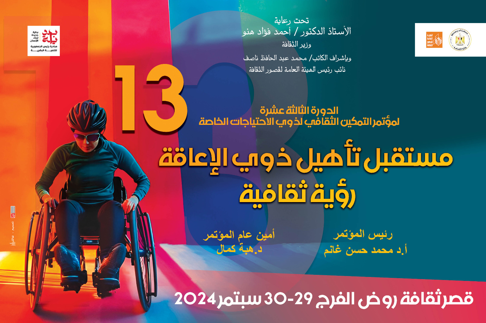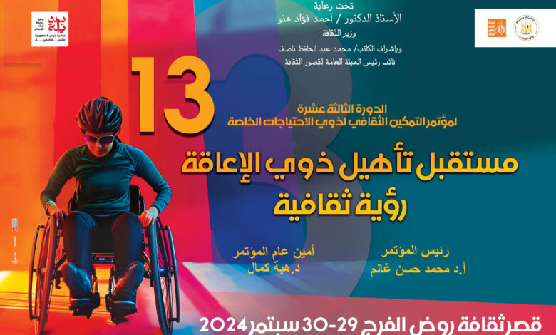 اختتم المؤتمر السنوي للتمكين الثقافى لذوي الاحتياجات الخاصة بوزارة الثقافة أعماله بقصر ثقافة روض الفرج في دورته الثالثة عشر والذي جاء هذا العام بعنوان “مستقبل تأهيل ذوي الإعاقة رؤية ثقافية” تحت رعاية الدكتور/ أحمد فؤاد هنو وزير الثقافة وبإشراف الكاتب/ محمد عبد الحافظ ناصف، نائب رئيس الهيئة العامة لقصور الثقافة والشاعر الدكتور/ مسعود شومان، رئيس الإدارة والمركزية للشئون الثقافية وكانت هذه الدورة من المؤتمر برئاسة الأستاذ الدكتور/ محمد حسن غانم أستاذ ورئيس قسم علم النفس السابق بكلية الآداب جامعة حلوان وبأمانة الدكتورة/ هبه كمال، مدير عام الإدارة العامة للتمكين الثقافى وبرئاسة اللجنة العلمية للأستاذ الدكتور/ مصطفى صادق، أستاذ التربية الخاصة بجامعة طنطا ورئيس الإتحاد المصرى البارولمبى للكرة الطائرة، والأستاذ الدكتور/ محمود إسماعيل أستاذ الإعلام بجامعة عين شمس والدكتور/ وليد نادي مدير إدارة البرامج والذي نفذته الإدارة العامة للتمكين الثقافى لذوى الاحتياجات الخاصة بوزارة الثقافة برئاسة الدكتورة/ هبة كمال وتضمنت فاعلياته المؤتمر حفل إفتتاح تم فيه تكريم عدد من الرموز العلمية ومن ذوي الهمم ممن قدموا بصمات ثرية فى مجالاتهم.